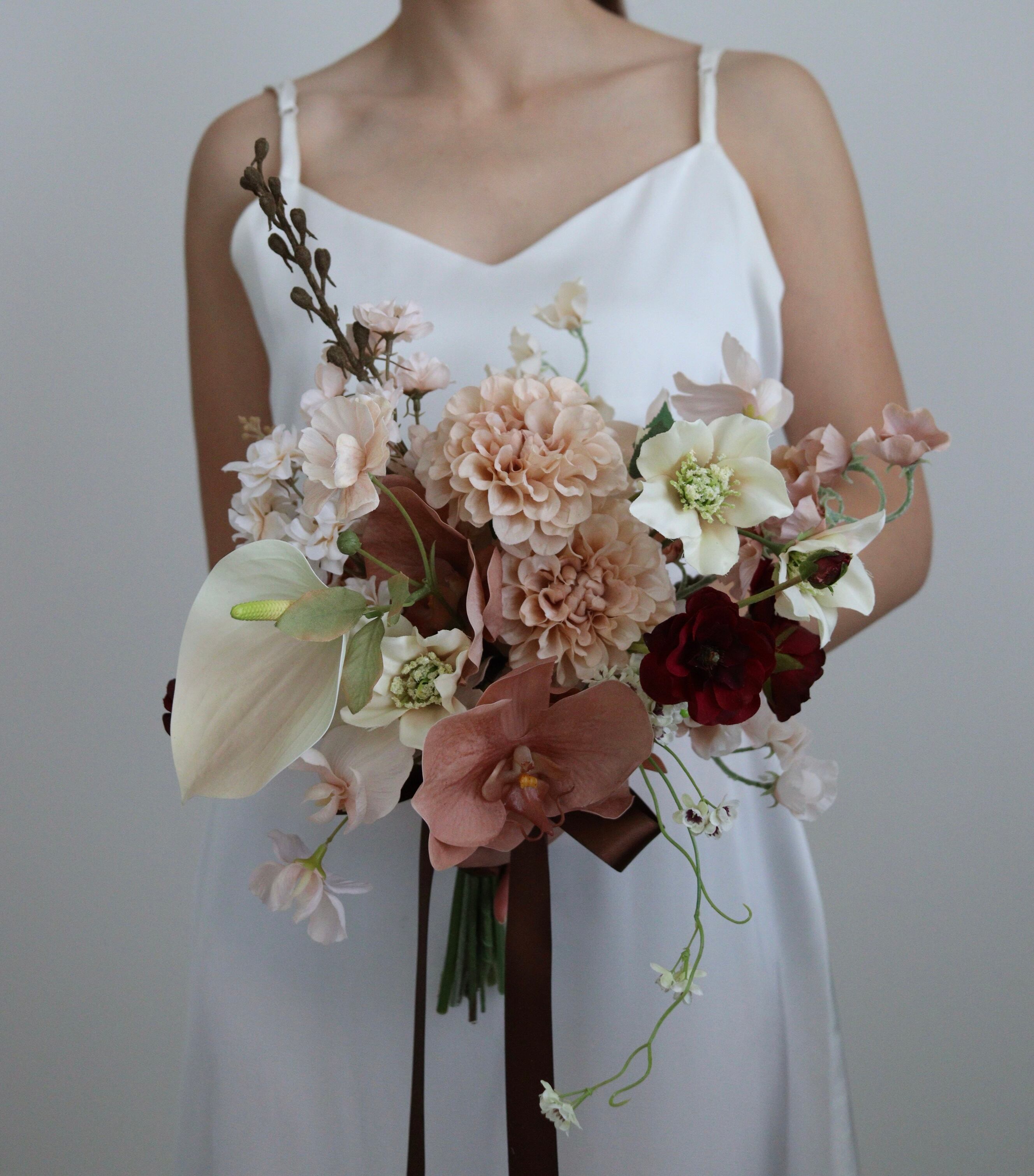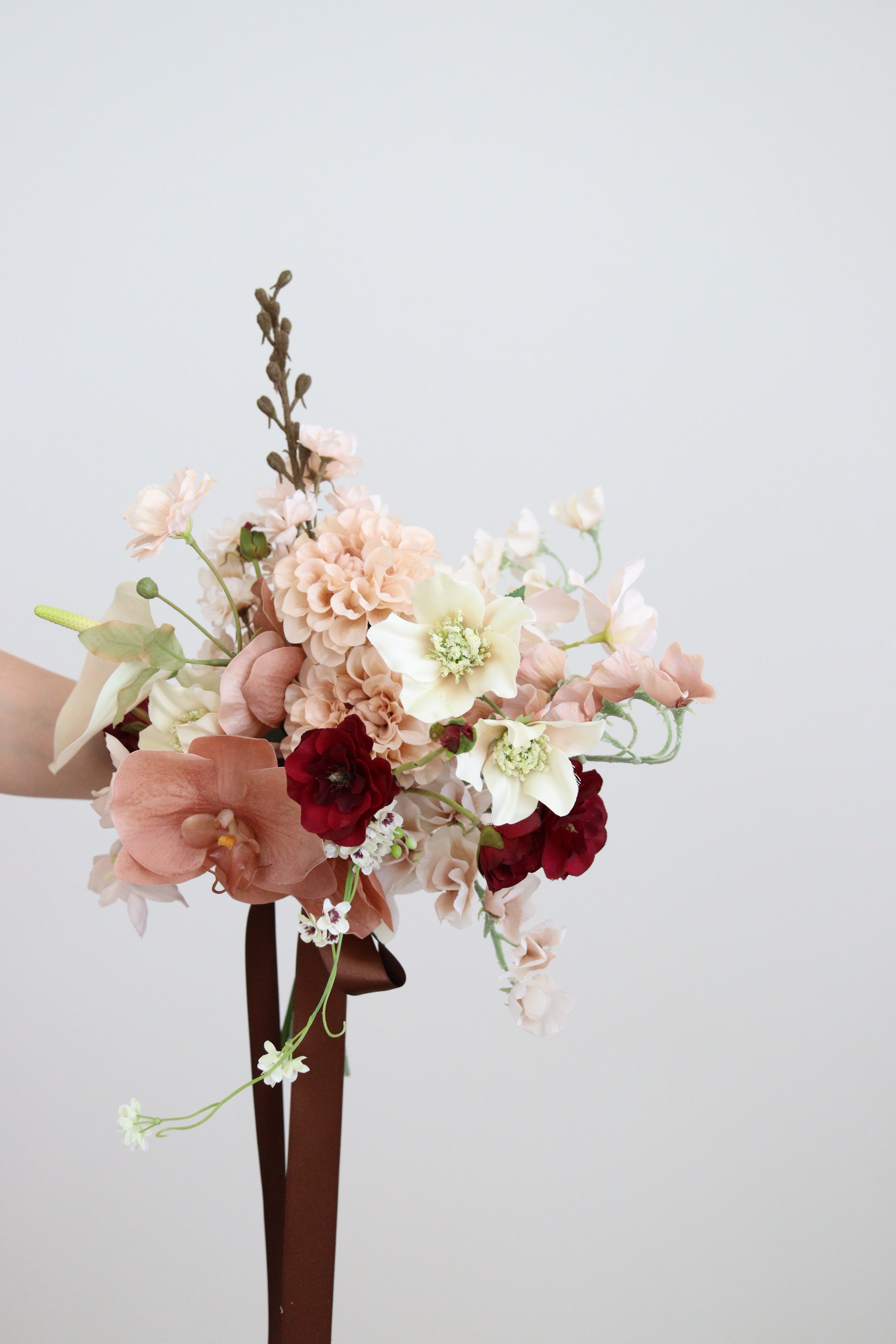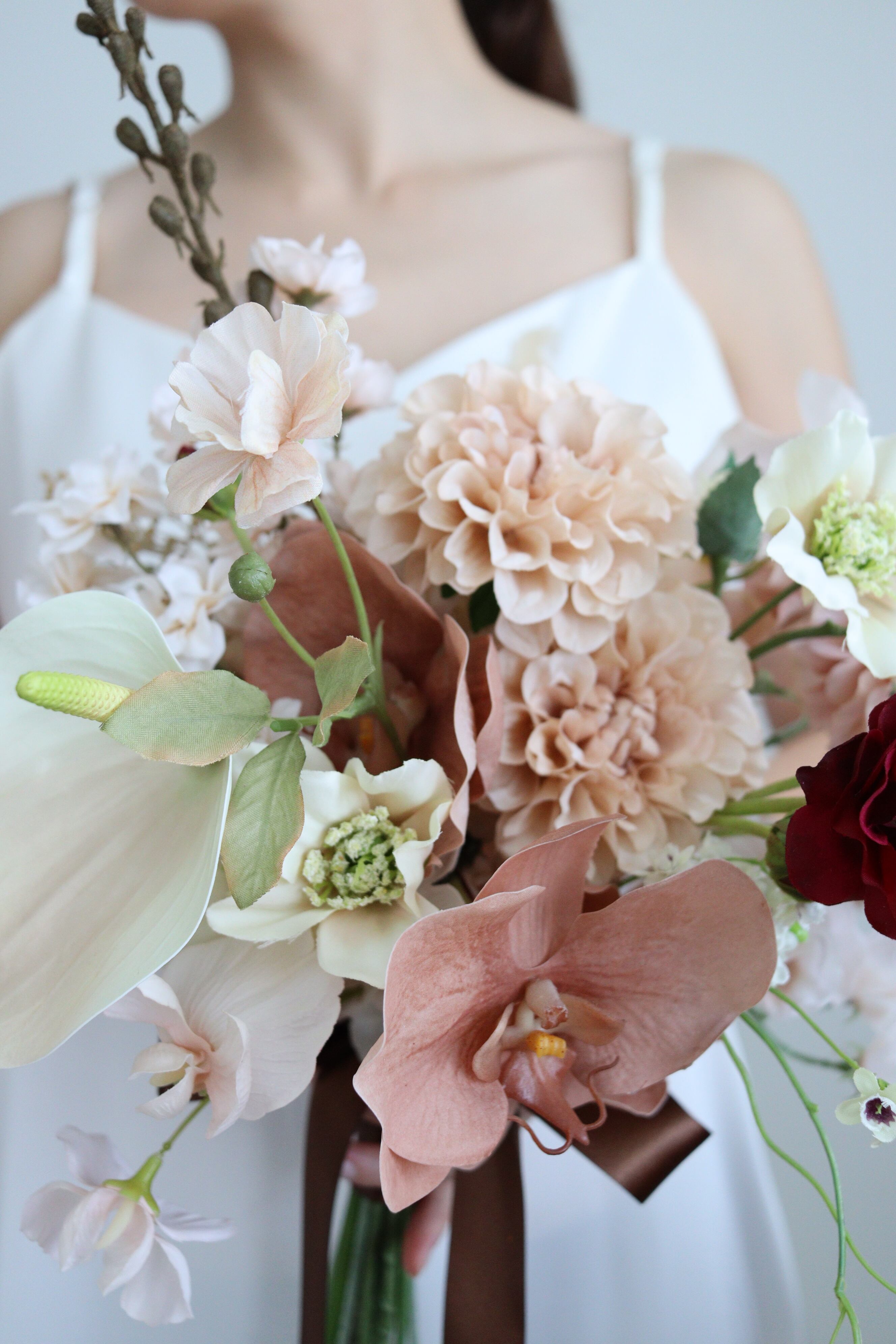 生花だと結婚式を挙げられる時期によってはお好きなお花をブーケに入れることが難しい場合もあると思いますが,アーティフィシャルフラワーだといつでもお好きなお花を選んで頂くことが出来ます。