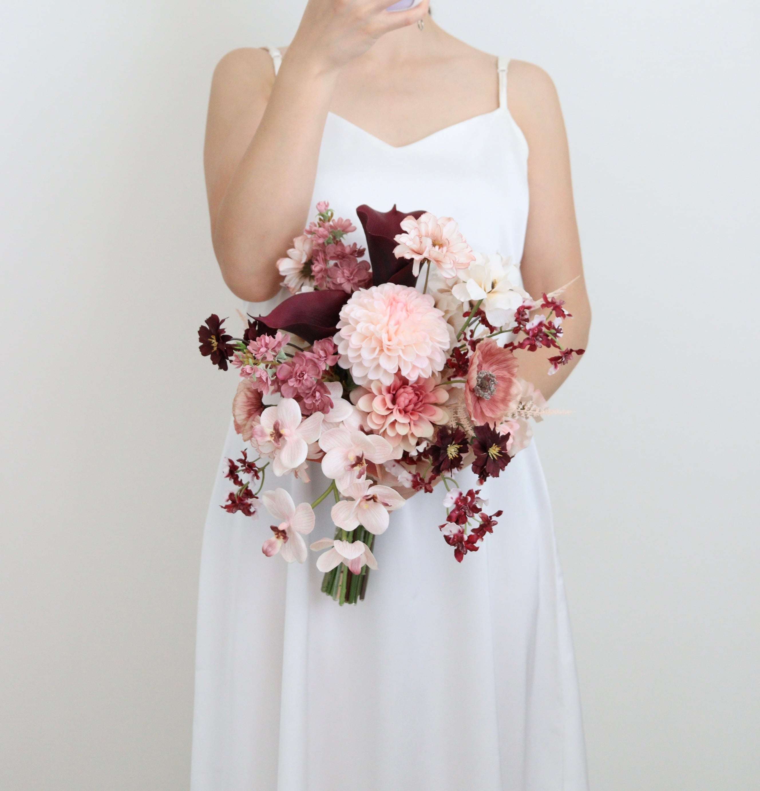 生花だと結婚式を挙げられる時期によってはお好きなお花をブーケに入れることが難しい場合もあると思いますが,アーティフィシャルフラワーだといつでもお好きなお花を選んで頂くことが出来ます。