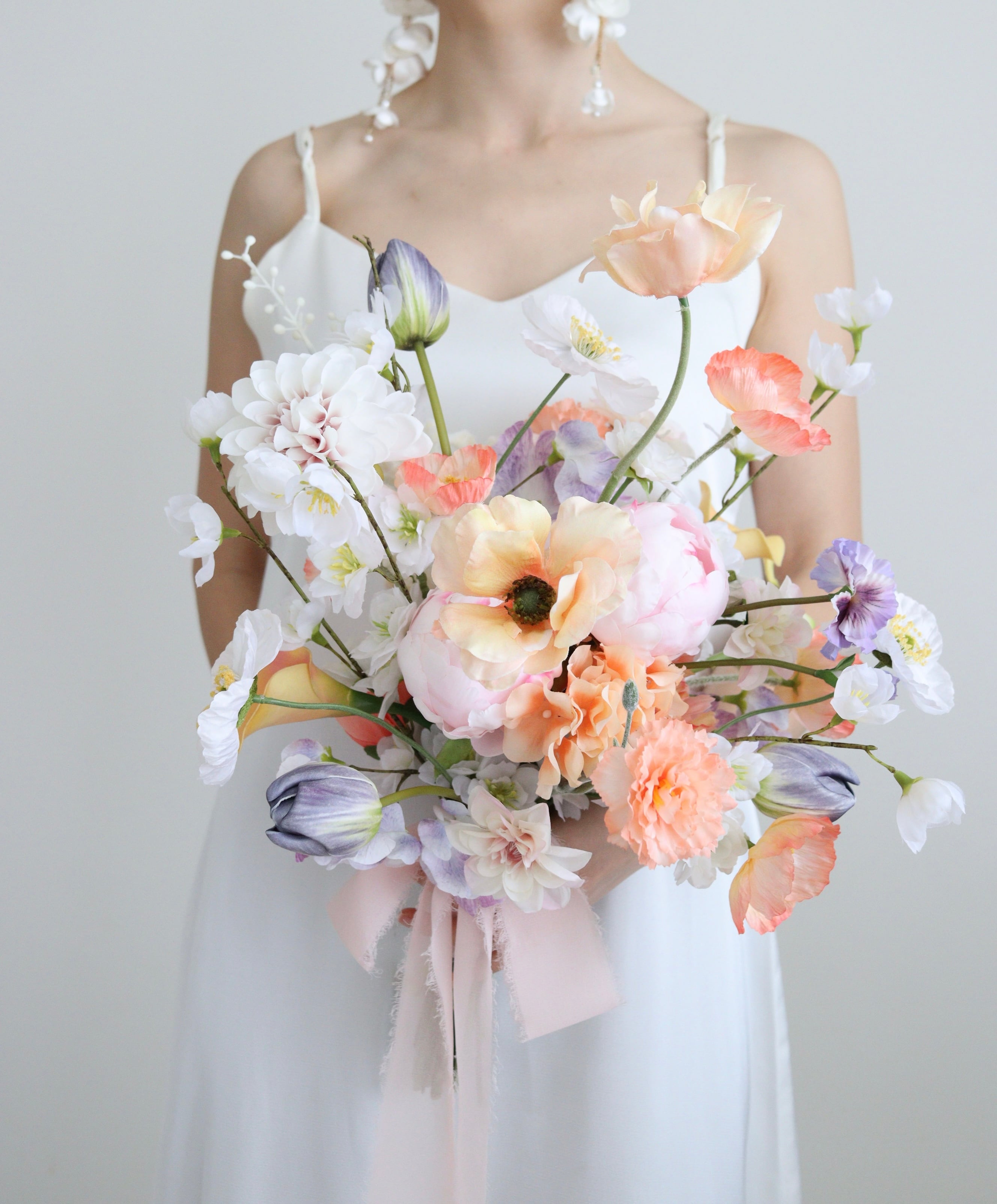 生花だと結婚式を挙げられる時期によってはお好きなお花をブーケに入れることが難しい場合もあると思いますが,アーティフィシャルフラワーだといつでもお好きなお花を選んで頂くことが出来ます。