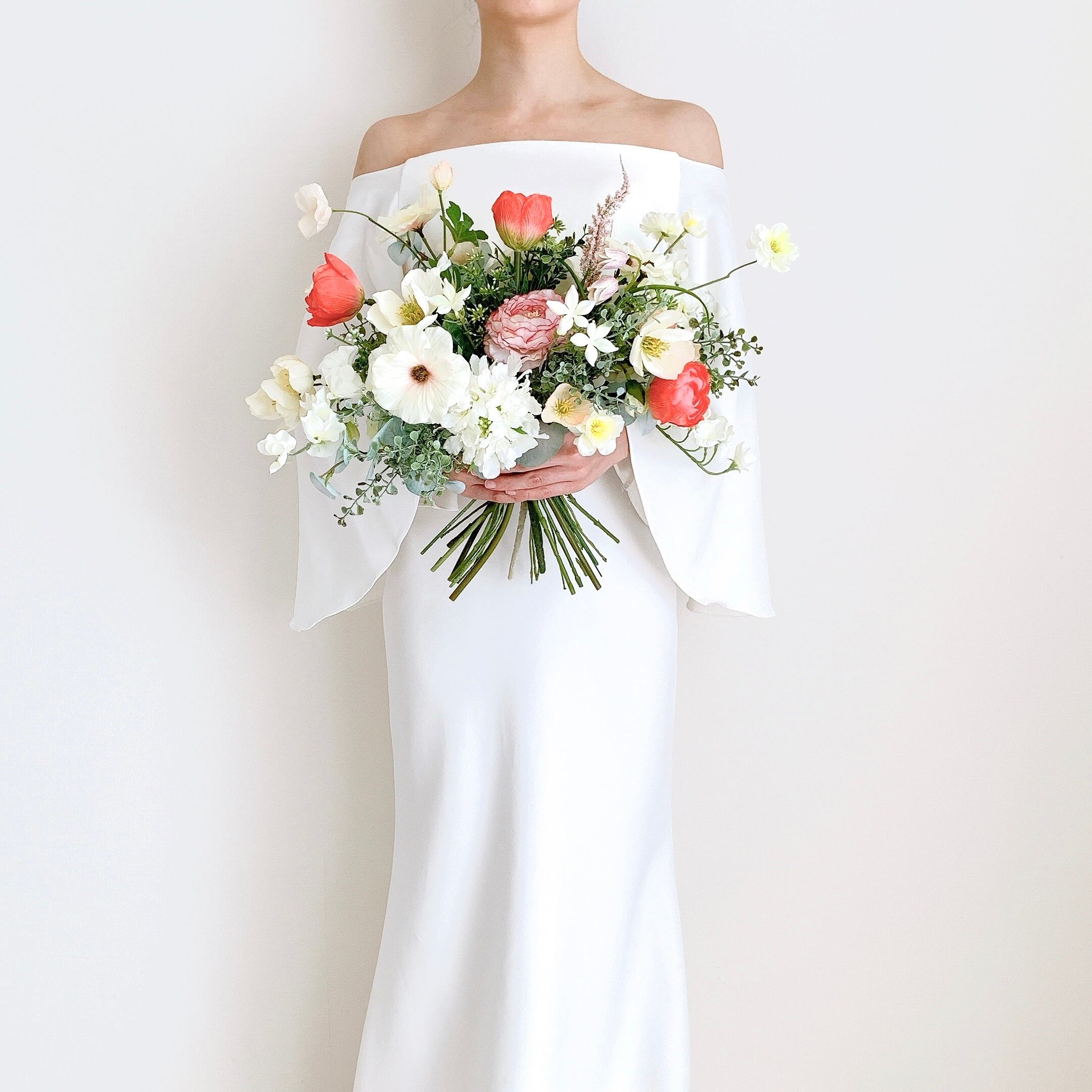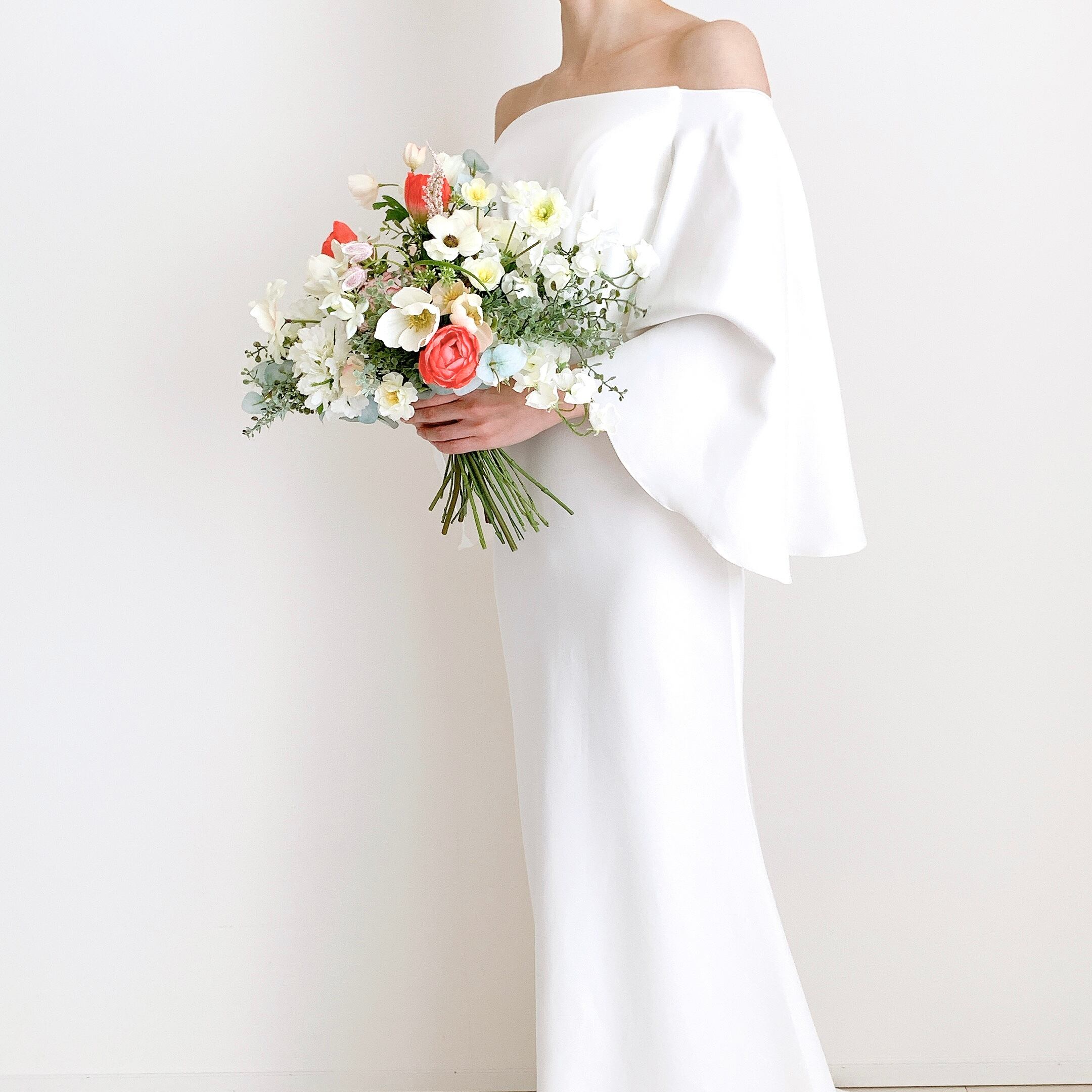 チューリップやラナンキュラス,バターカップカップなど、春の小花をたっぷり使用し、春らしく明るいお色でまとめました❀