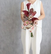 カラー×マグノリアのバーガンディウェディングブーケ&ブートニア 完成品 ピンク レッド
