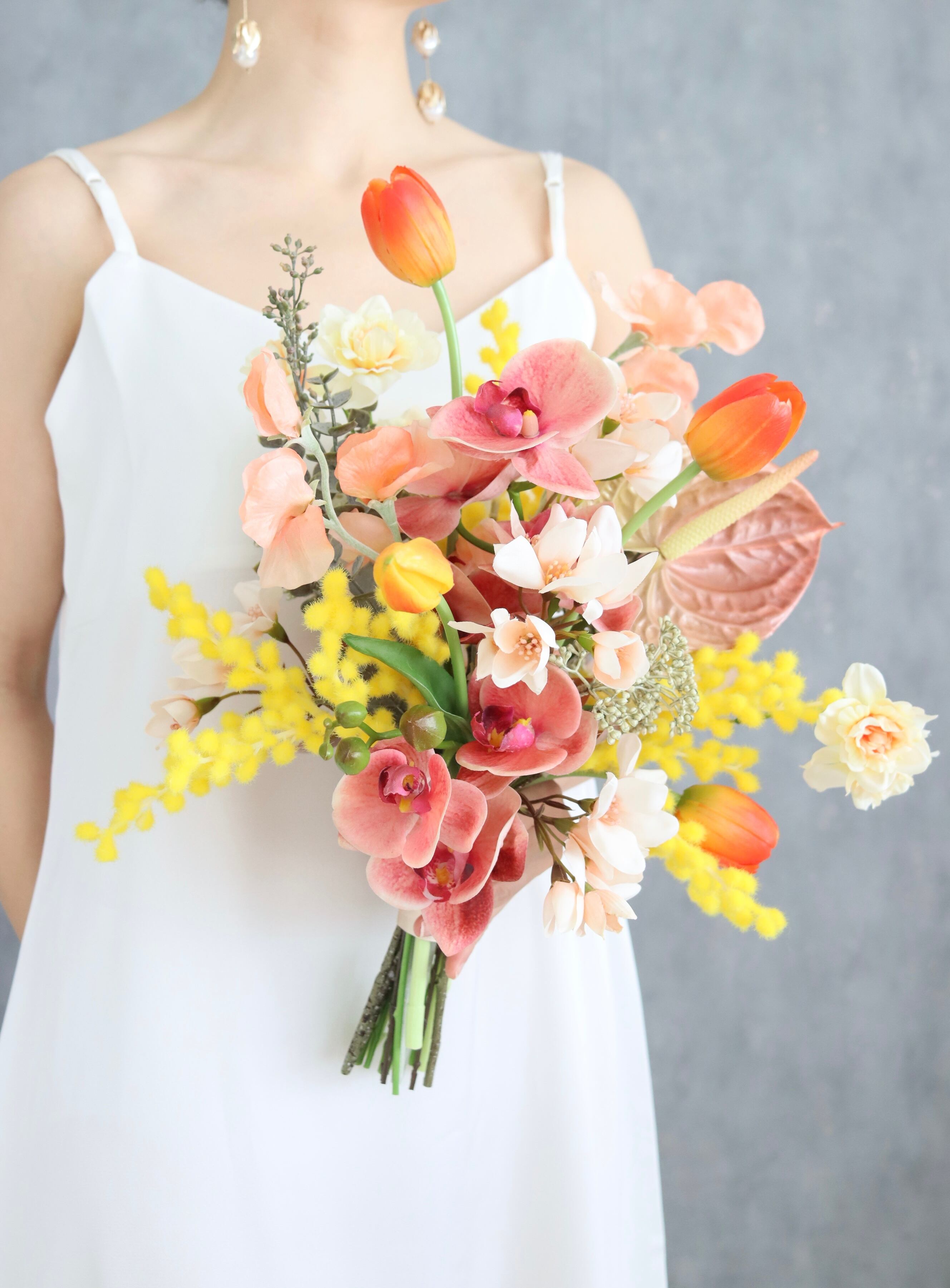 【専用ページ】ヘッドパーツ追加 ミモザの春のハッピーカラーブーケ&ブートニア 春ブーケ 完成品ウェディングブーケ 即納可能 胡蝶蘭 チューリップ