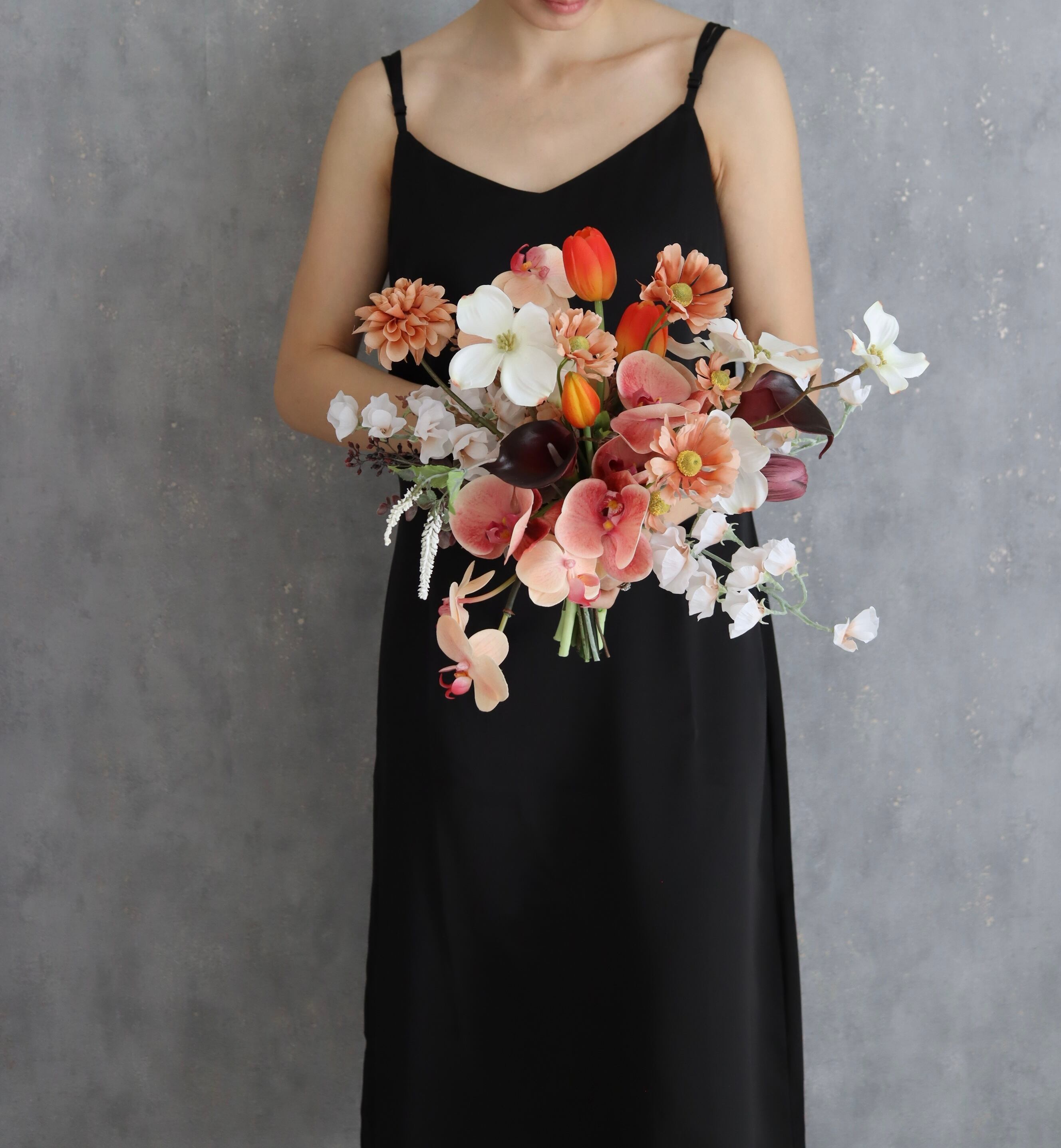 オレンジ色のチューリップ、ピーチカラーの胡蝶蘭、バーガンディーのカラーでカラフルなウェディングブーケに♡