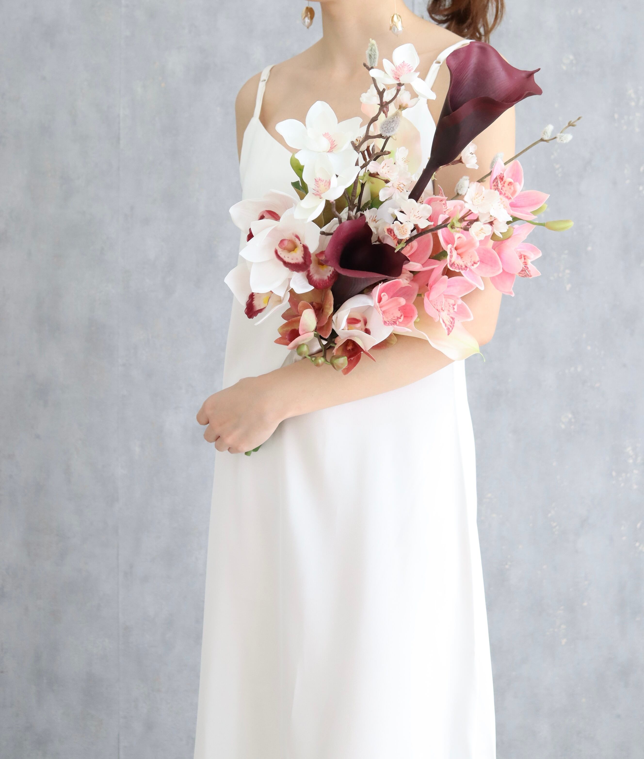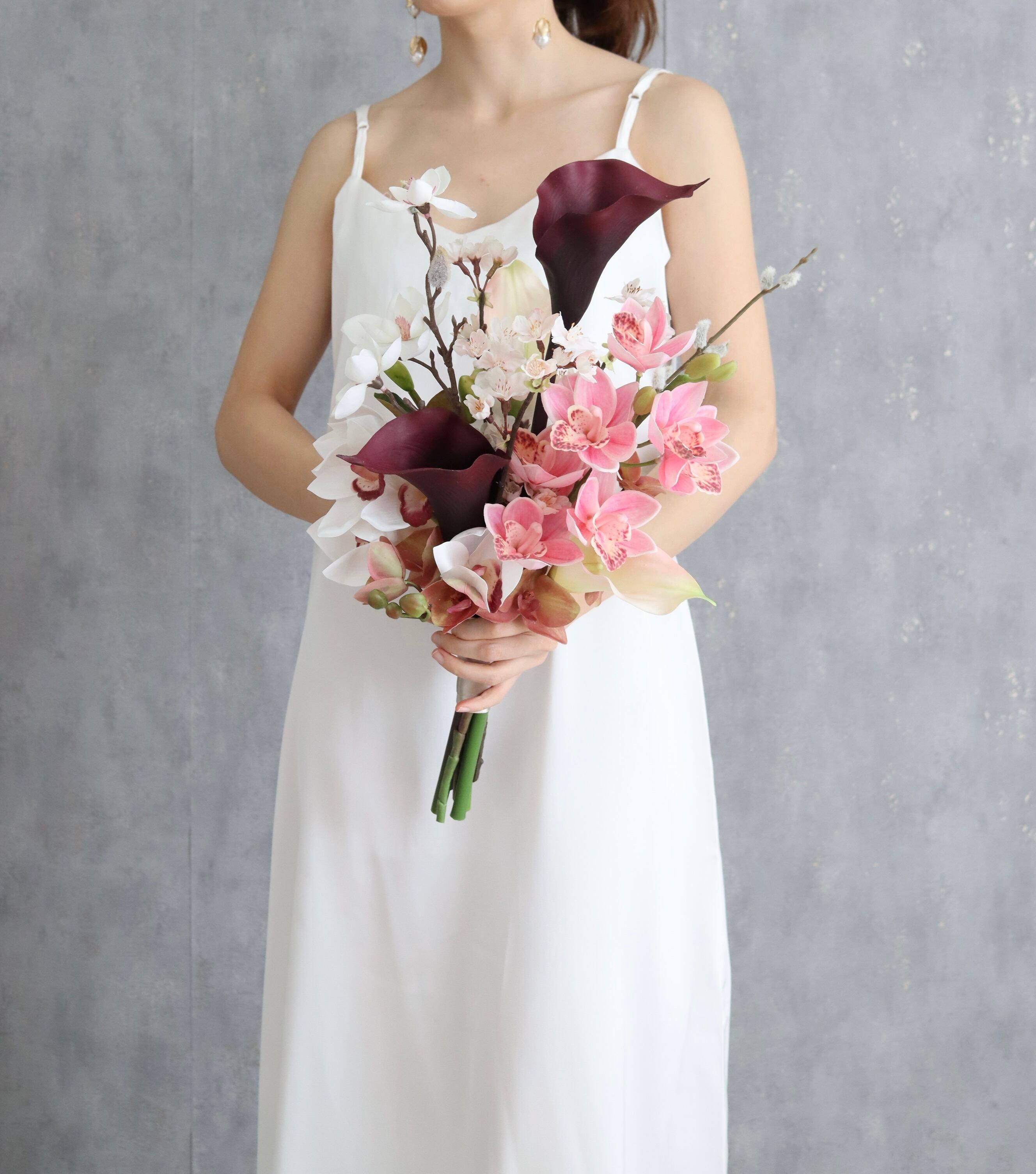 カラーと桜の縦長ウェディングブーケ 完成品 即納可能