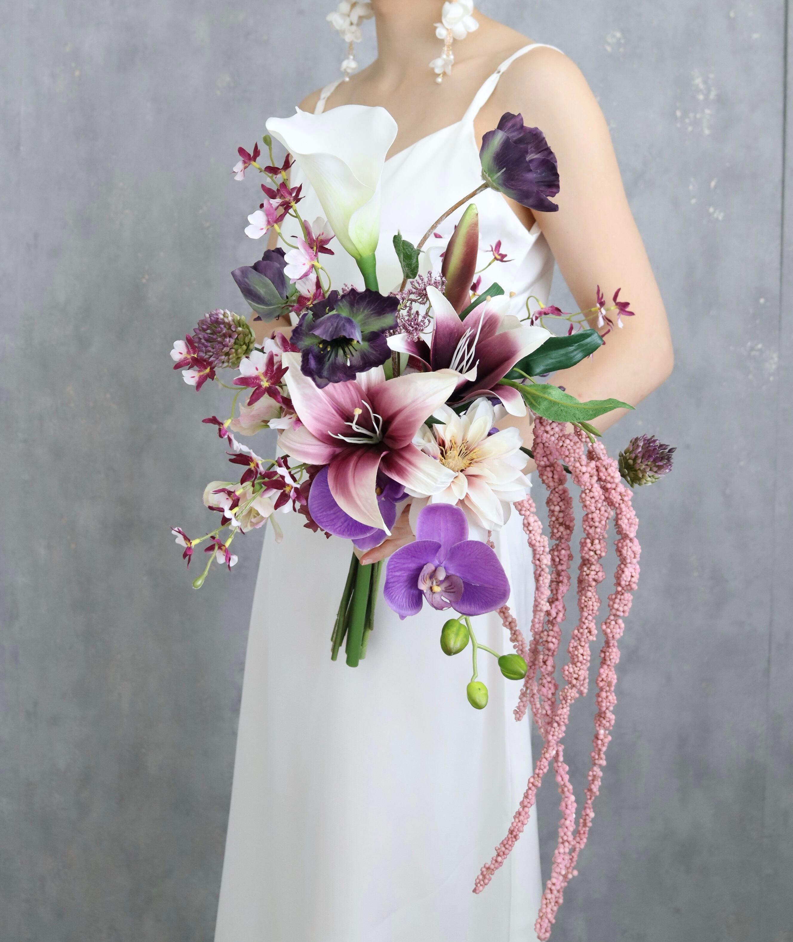生花だと結婚式を挙げられる時期によってはお好きなお花をブーケに入れることが難しい場合もあると思いますが,アーティフィシャルフラワーだといつでもお好きなお花を選んで頂くことが出来ます。