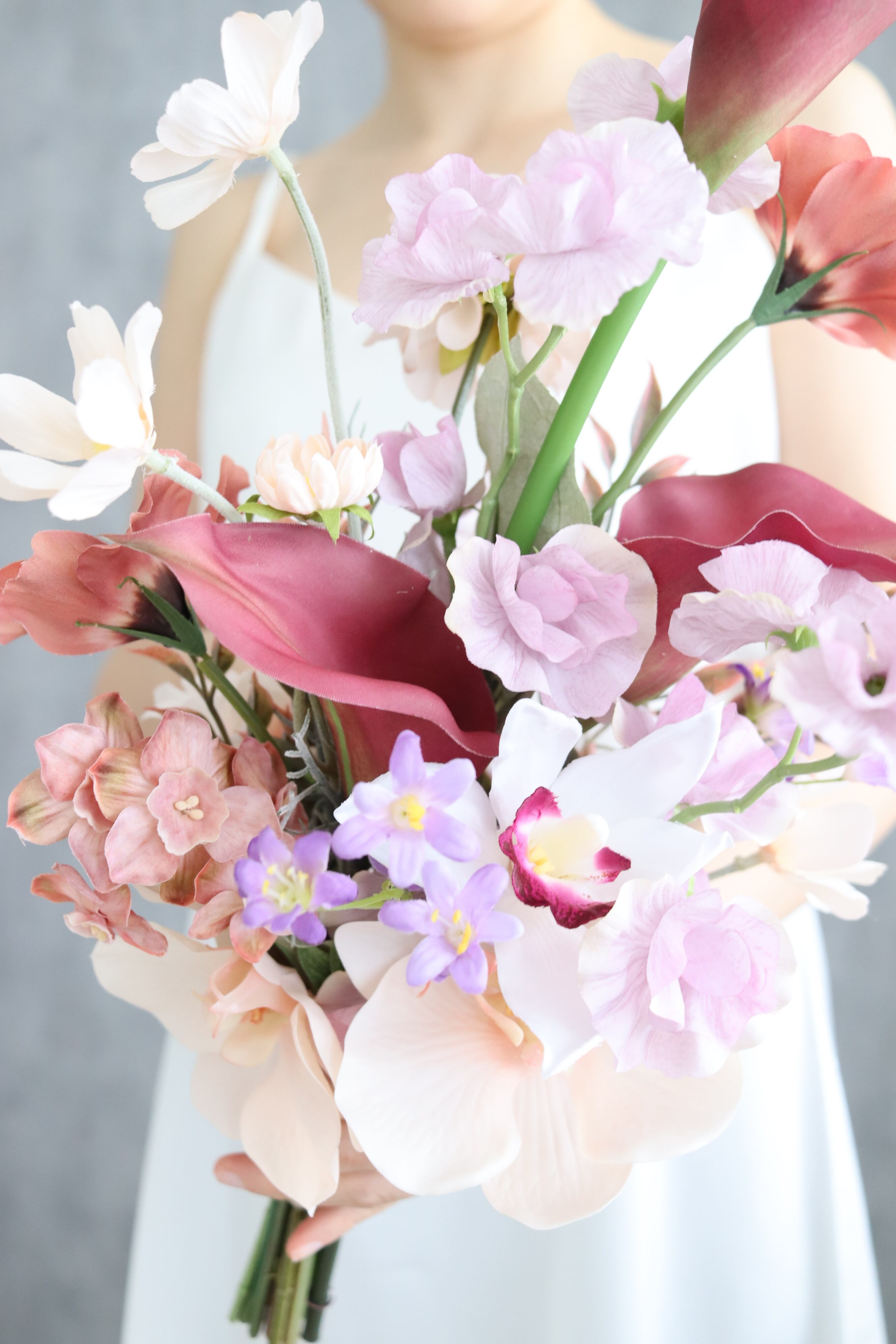 ワインカラーとパープルピンクの上品なアームブーケ