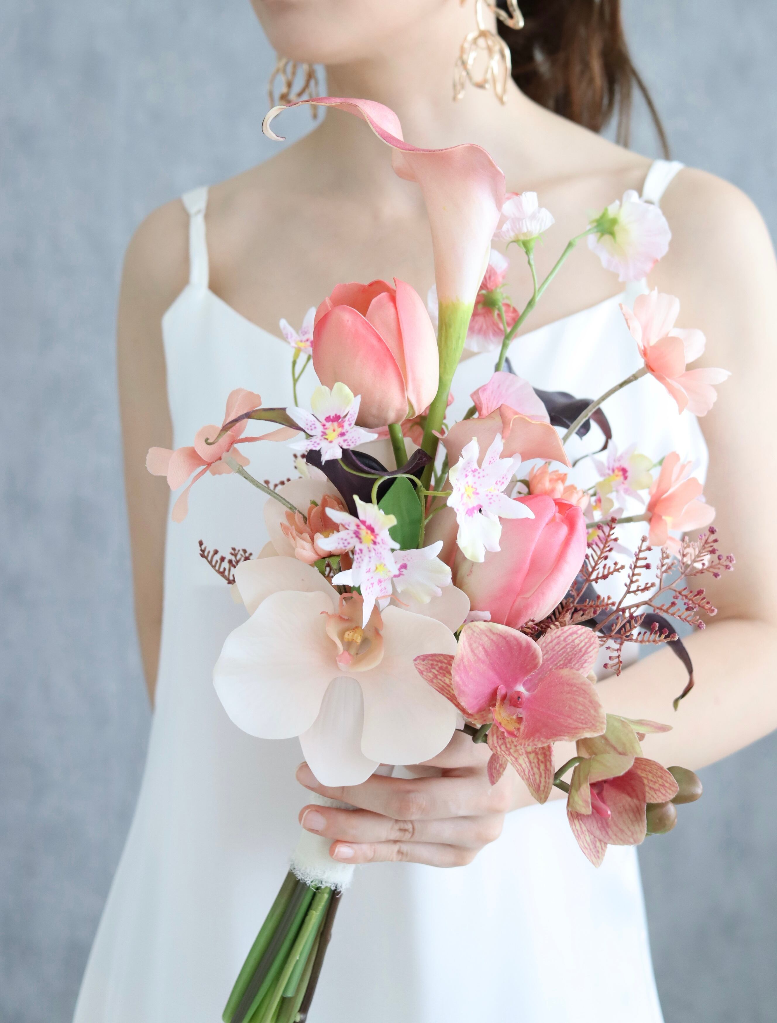 生花だと結婚式を挙げられる時期によってはお好きなお花をブーケに入れることが難しい場合もあると思いますが,アーティフィシャルフラワーだといつでもお好きなお花を選んで頂くことが出来ます。